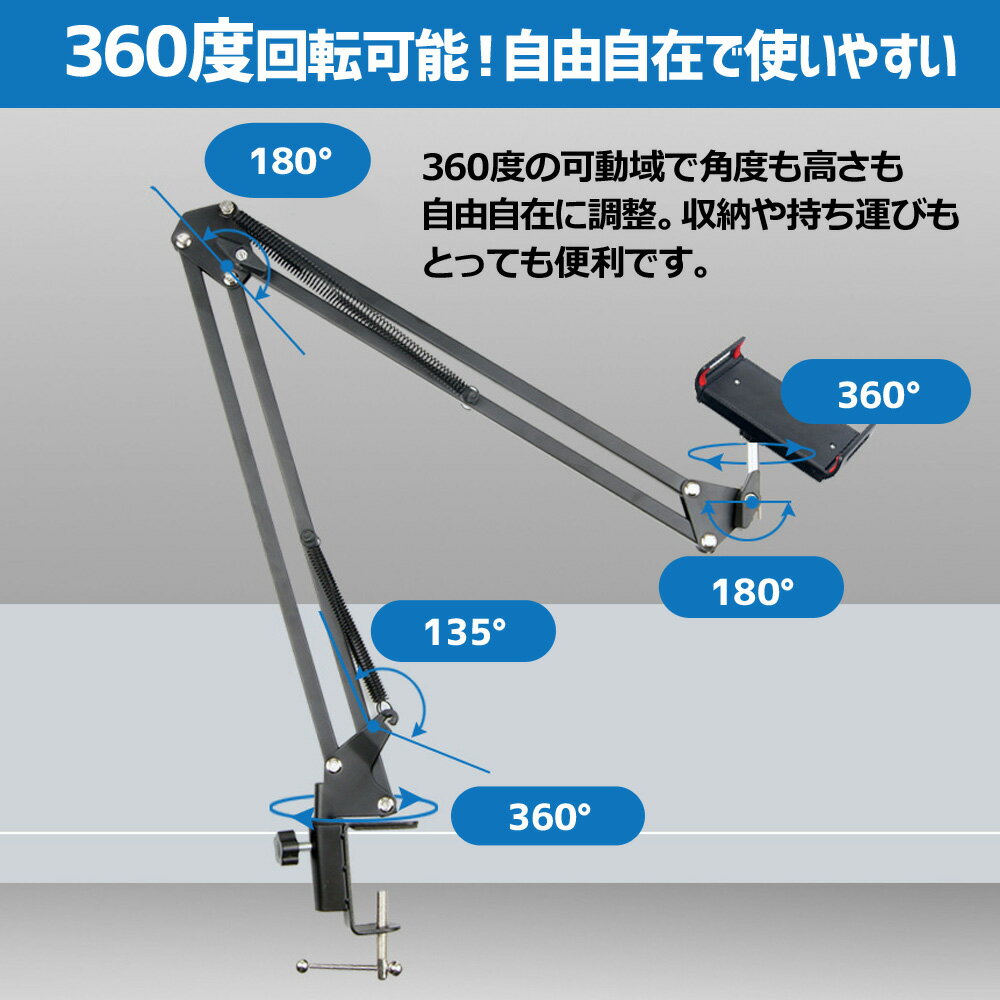 タブレット スタンド アーム型 スマホ スマートフォン タブレットアームスタンド ホルダー 360度回転 寝ながら iPad iPhone アイフォン 頑丈 丈夫 金属 角度調整 多機種対応 クランプ式 10インチ 送料無料