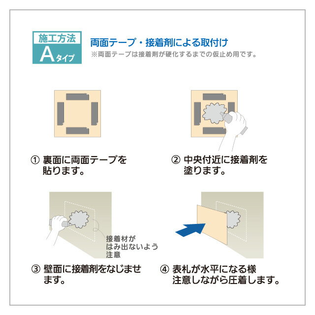 ■施工方法について 壁面が平面の場合は施工方法Hタイプ(両面テープが必要) 壁面に凹凸がある場合は施工方法Aタイプ(両面テープと接着剤が必要) ※表札取付け用の接着剤等は、付属しておりません。