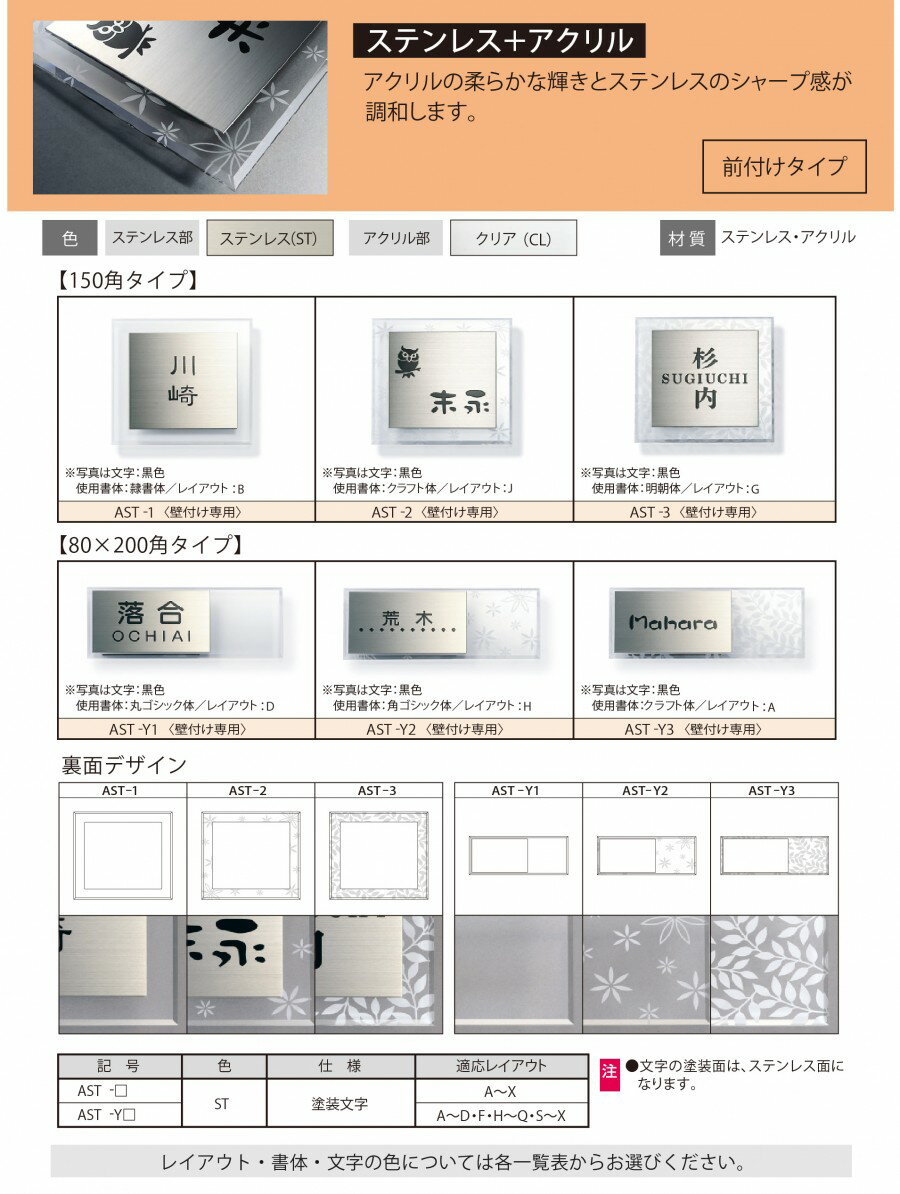 商 品 詳 細商品名三協アルミ【ステンレス+クリアアクリル】AST-Y2サイズW200×H80カラーアクリル部:クリア(CL)書体レイアウト:10種類 A、B、C、D、F、H、I、J、K、L 字書体:13種類材質ステンレス/アクリルご注文方法STEP-1:ご注文時の備考欄に名前をご記入ください。