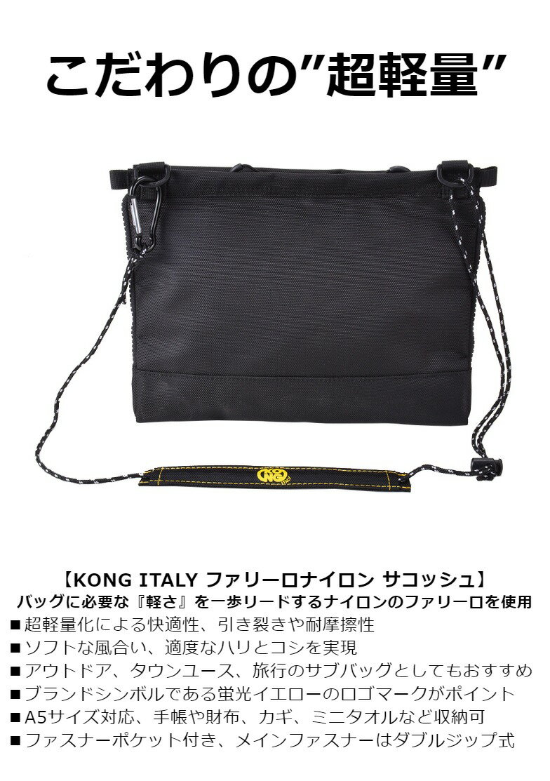 【KONG ITALY ファリーロナイロン サコッシュ 53001】 バッグに必要な『軽さ』を一歩リードする、ナイロン素材のファリーロを本体生地に使用。