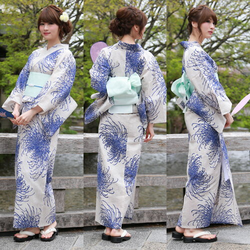 【期間限定クーポンSALE】浴衣 セット レトロ レディース 高級綿麻浴衣3点セット「生成り地に紺乱菊」 浴衣 クリーム 白 菊 青 2020 古典柄 大人 しっとり 落ち着いた 粋